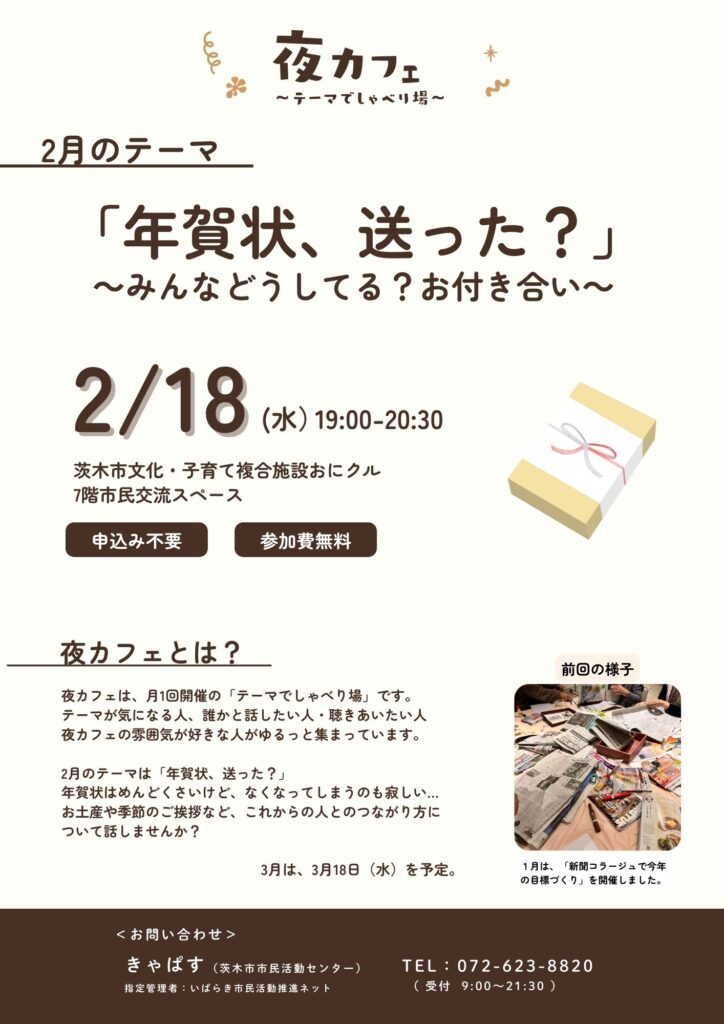 | イベント名 | 夜カフェ~テーマでしゃべり場~vol.27 「年賀状、送った?~みんなどうしてる?お付き合い~」 |