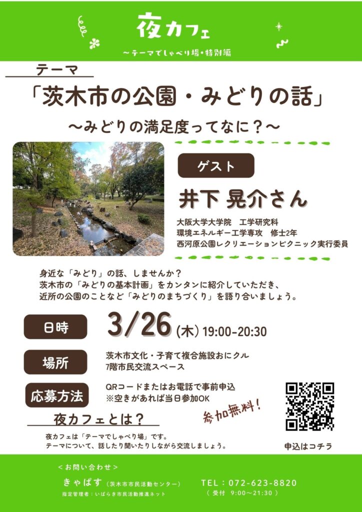 | イベント名 | 【夜カフェー特別編】 『 茨木市のみどり・公園の話 ~ みどりの満足ってなに?~』 |