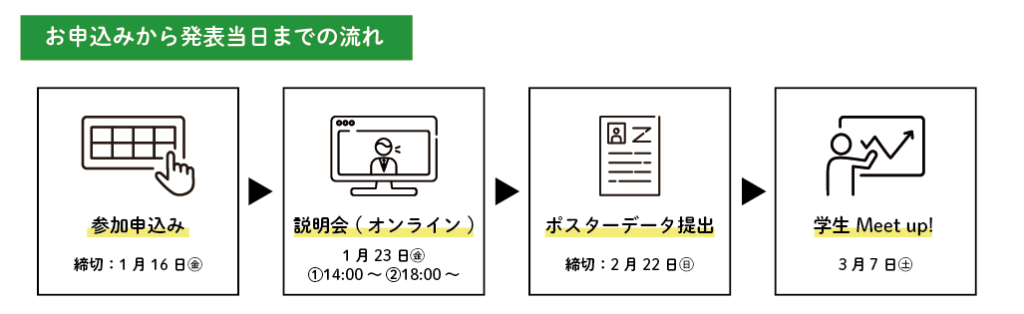 | 応募条件 | □ポスターセッション方式で活動発表ができること □展示パネル(W1200mm×H1950mm)へポスター(A0サイズ)を掲示し、発表、質疑応答に対応できること □説明会(オンライン)へ参加すること(必須) |