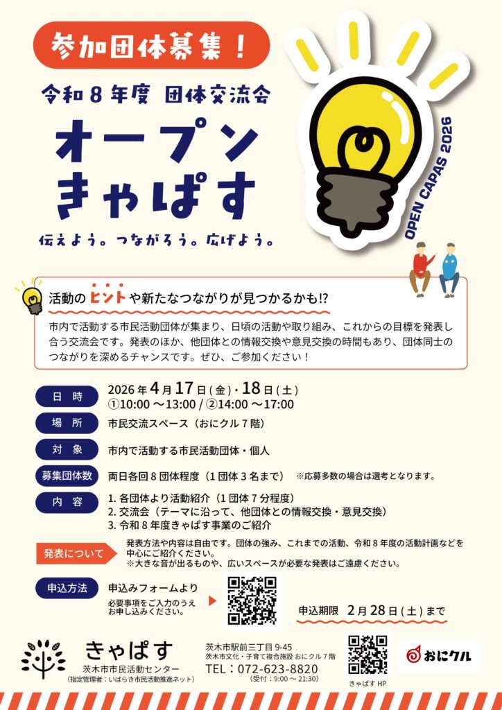 日頃の活動を紹介し合い、他団体の取り組みを知り、交流を通してつながりを深めることで、今後の活動のヒントを得られる場として、団体交流会「オープンきゃぱす」を開催します!