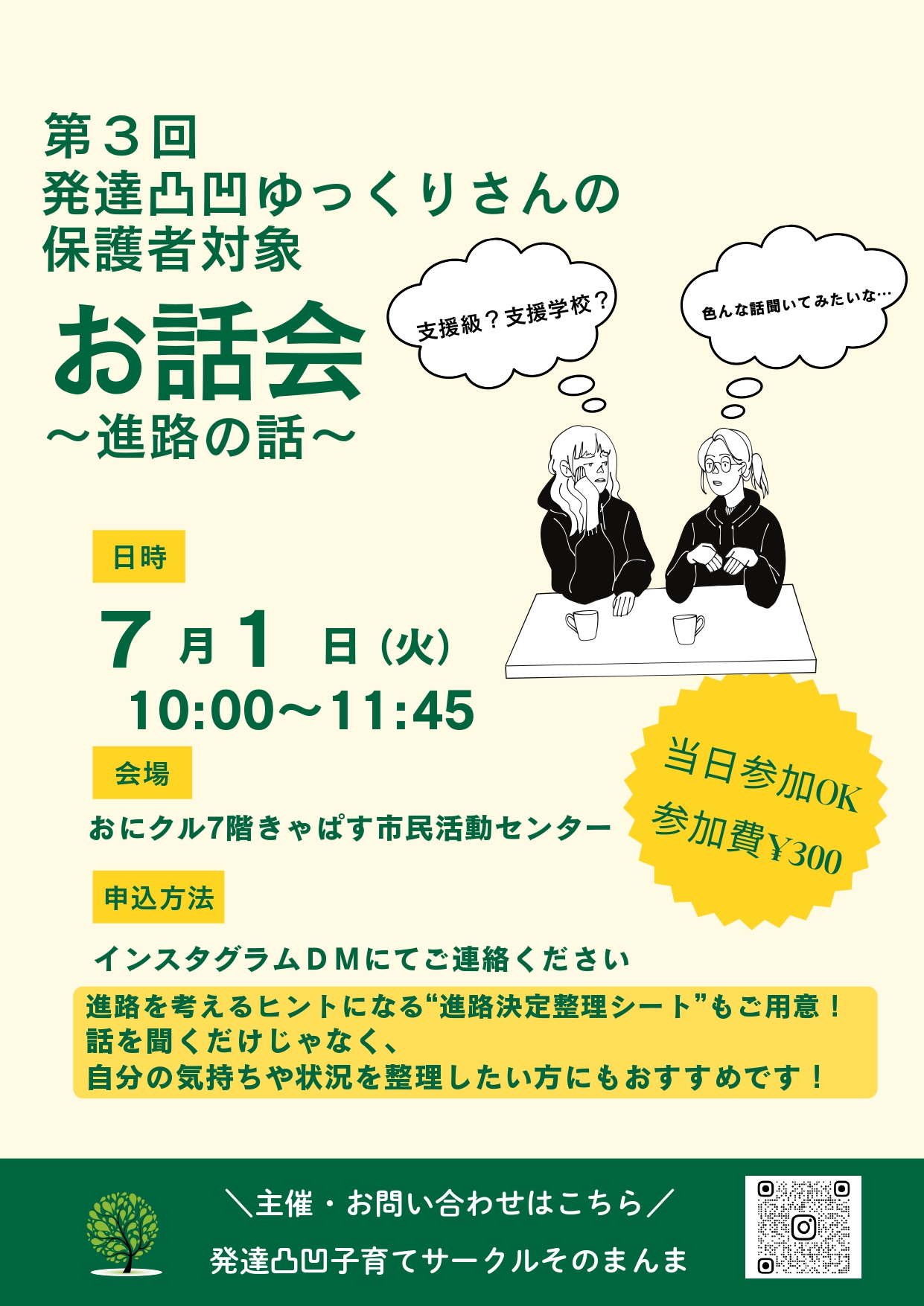 | 1 | 火 | 9:00~12:00 | お話会 ~進路の話~ | 発達凸凹子育てサークルそのまんま |