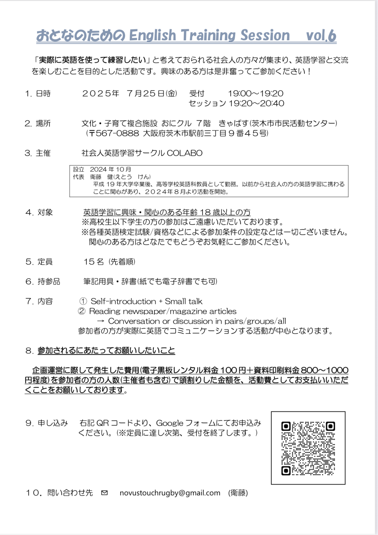 | 18:00~22:00 | おとなのためのEnglish training lesson part6 | 社会人英語学習 COLABO | ||