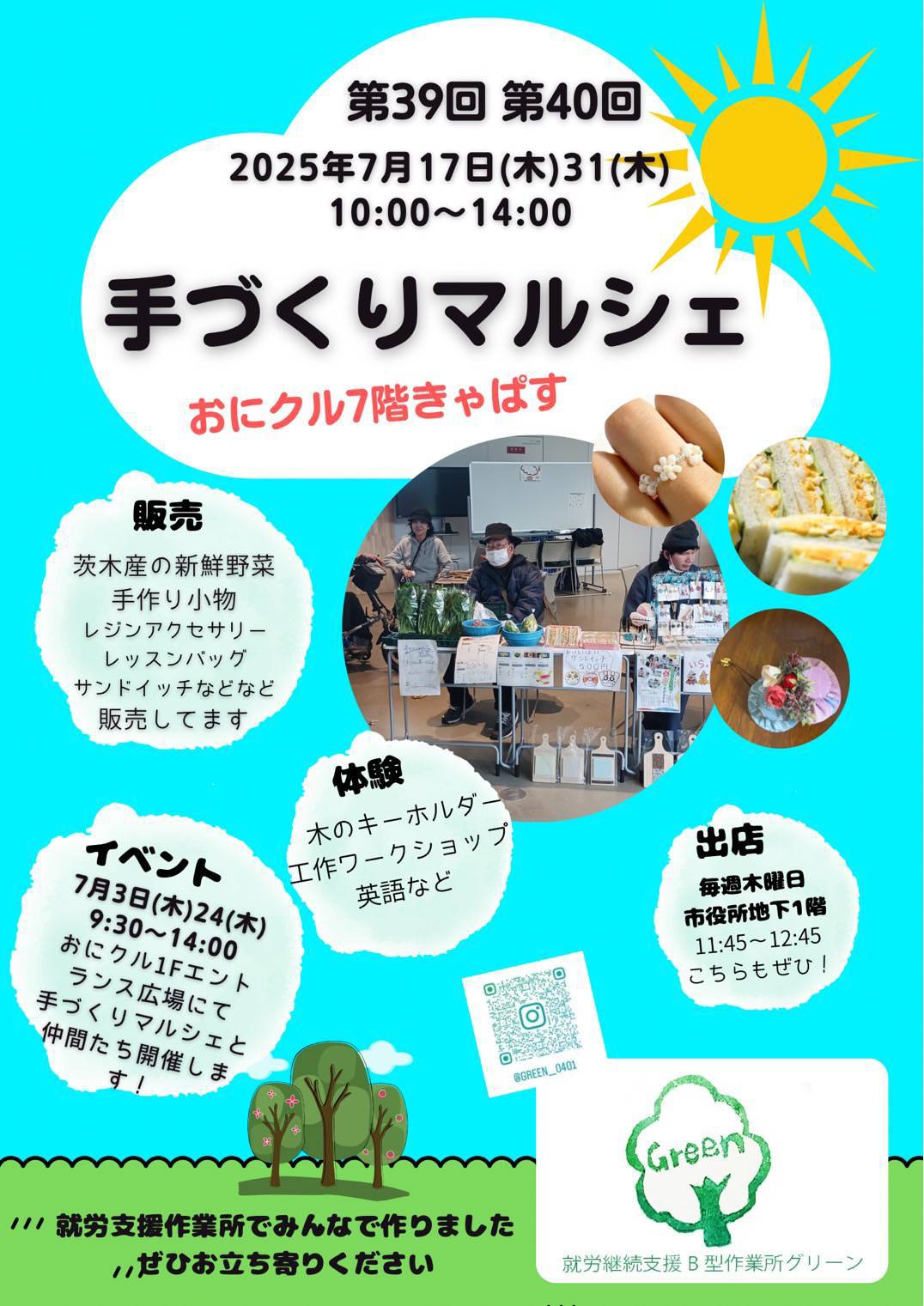 | 17 | 木 | 9:00~15:00 | 手作りマルシェ | グリーン |