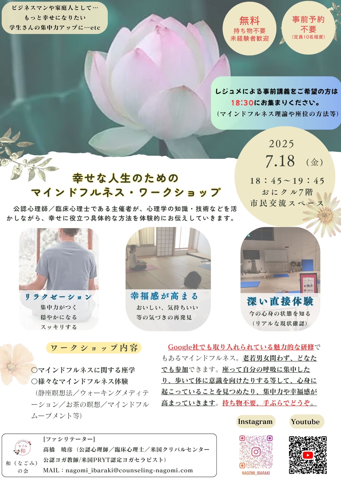 | 18:00~22:00 | マインドフルネス・ワークショップ | 和(なごみ)の会 | ||