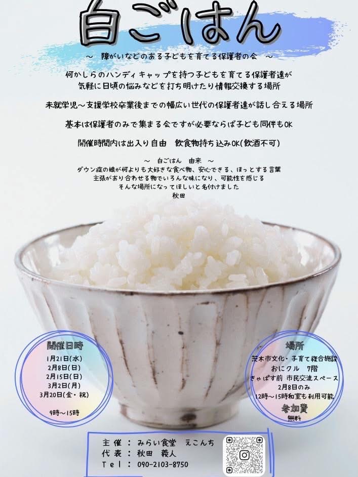| 20 | 金・祝 | 9:00~15:00 | 「白ごはん」(障がい等のある子を育てる保護者の会) | みらい食堂えこんち |