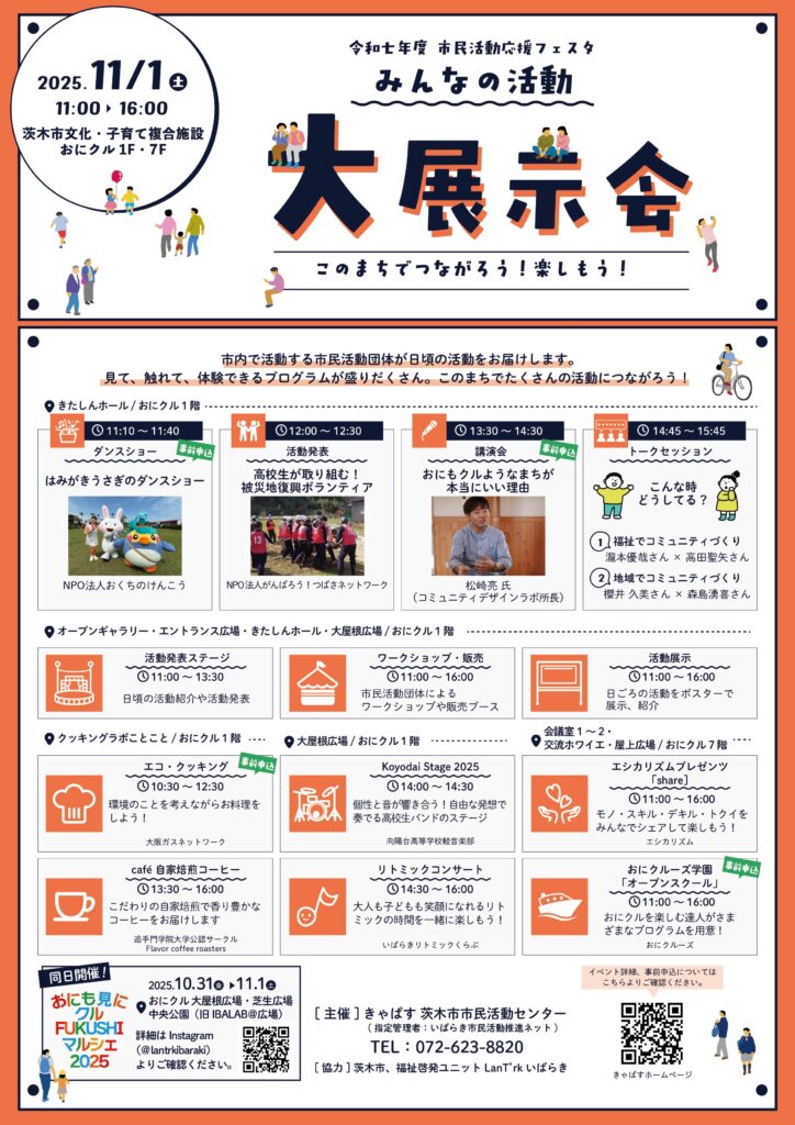 2025年11月1日(土)、市内における市民活動をより多くの方に知っていただき、市民活動団体と市民のみなさまとの交流を目的とした「市民活動応援フェスタ~みんなの活動大展示会~」を開催しました。前日が雨天で翌日も天気が危ぶまれましたが、当日は快晴!気持ちの良い一日となりました。